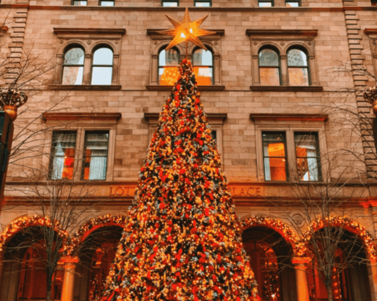 Few places define Christmas in New York like The Plaza Hotel. Known for its starring role in Home Alone 2: Lost in New York, this landmark hotel at the edge of Central Park is as iconic as it gets. Every December, The Plaza transforms its lobby into a golden wonderland filled with garlands, twinkling lights, and a towering Christmas tree that draws visitors from around the world.